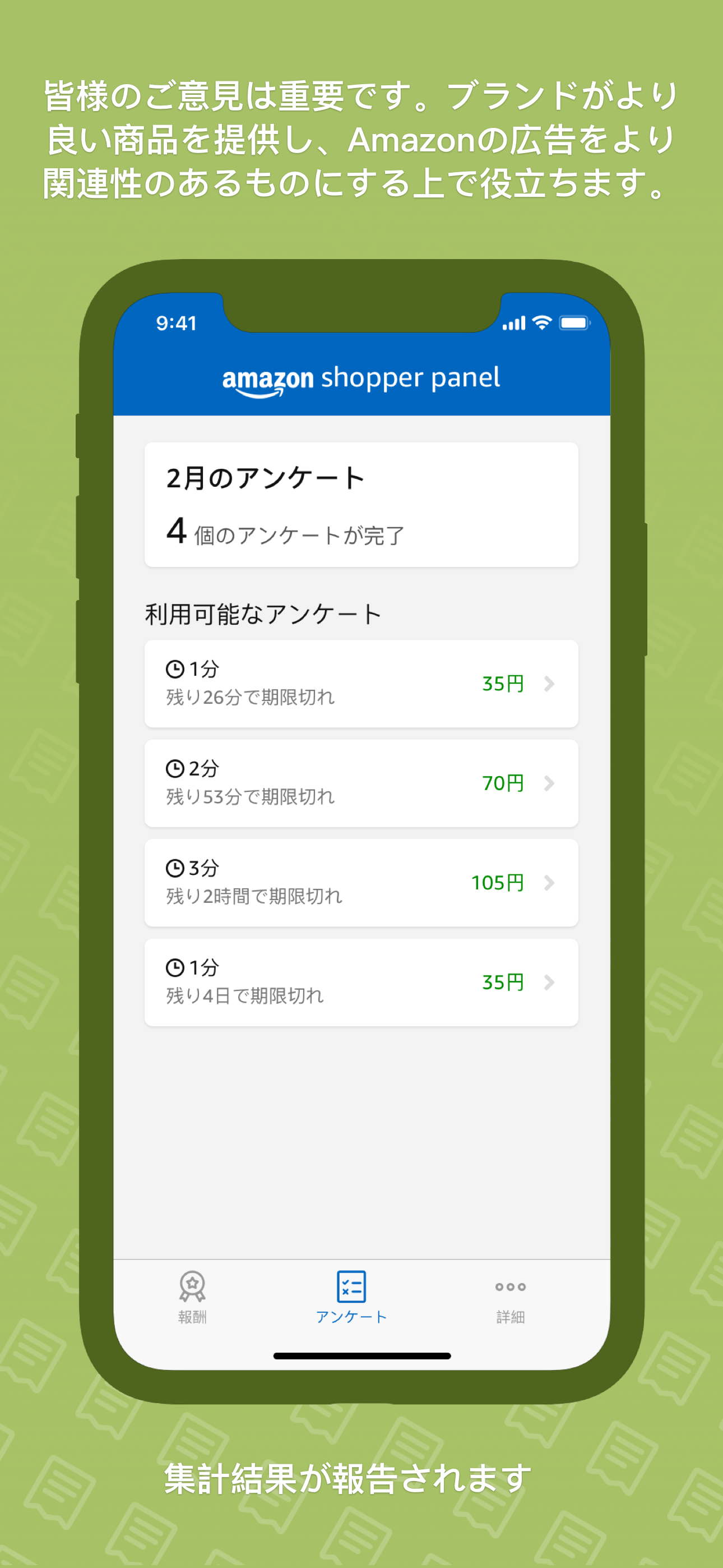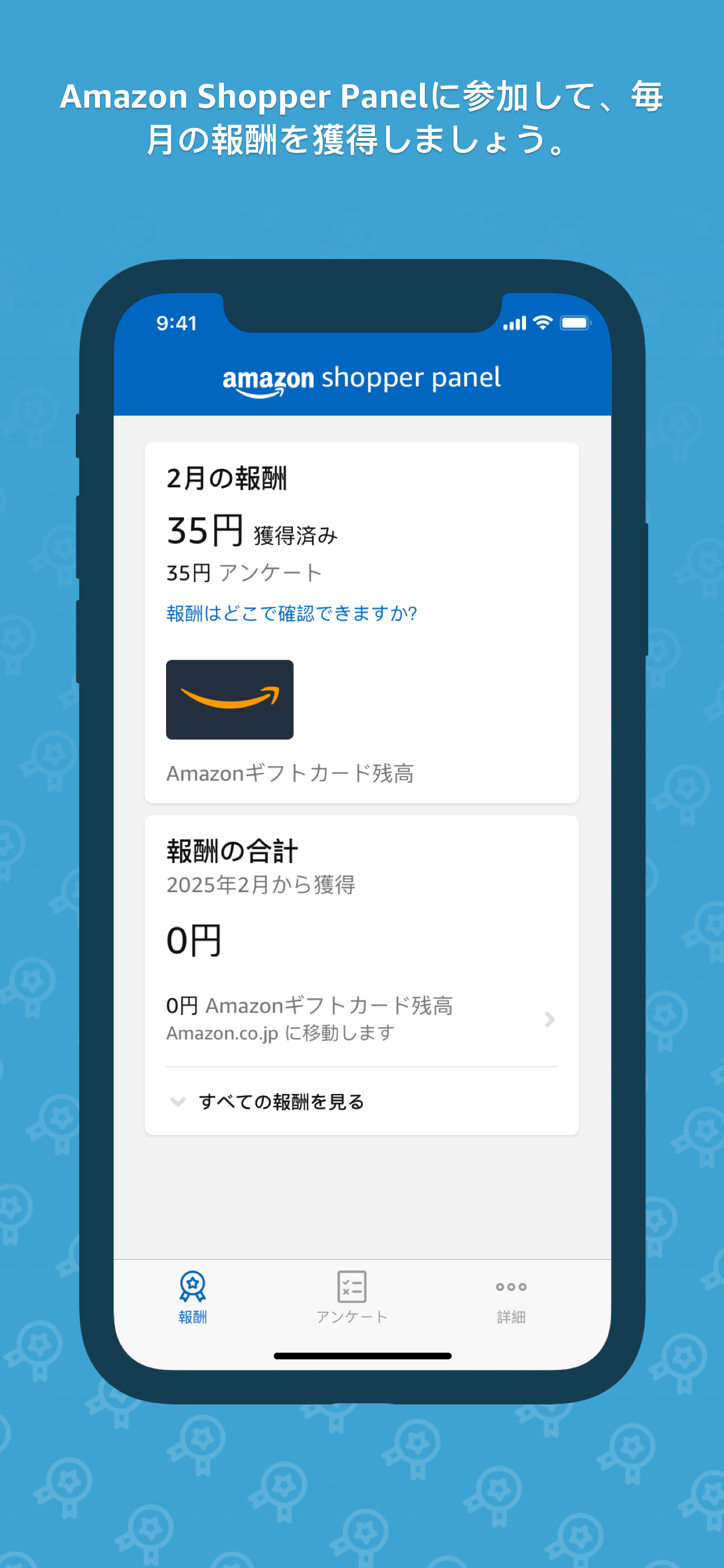Amazon Shopper Panelは招待制のオプトイン プログラムで、参加者は、自身が興味を持ちそうなブランドや商品に関する意見について簡単なアンケートに回答することで、毎月の報酬を獲得できます。