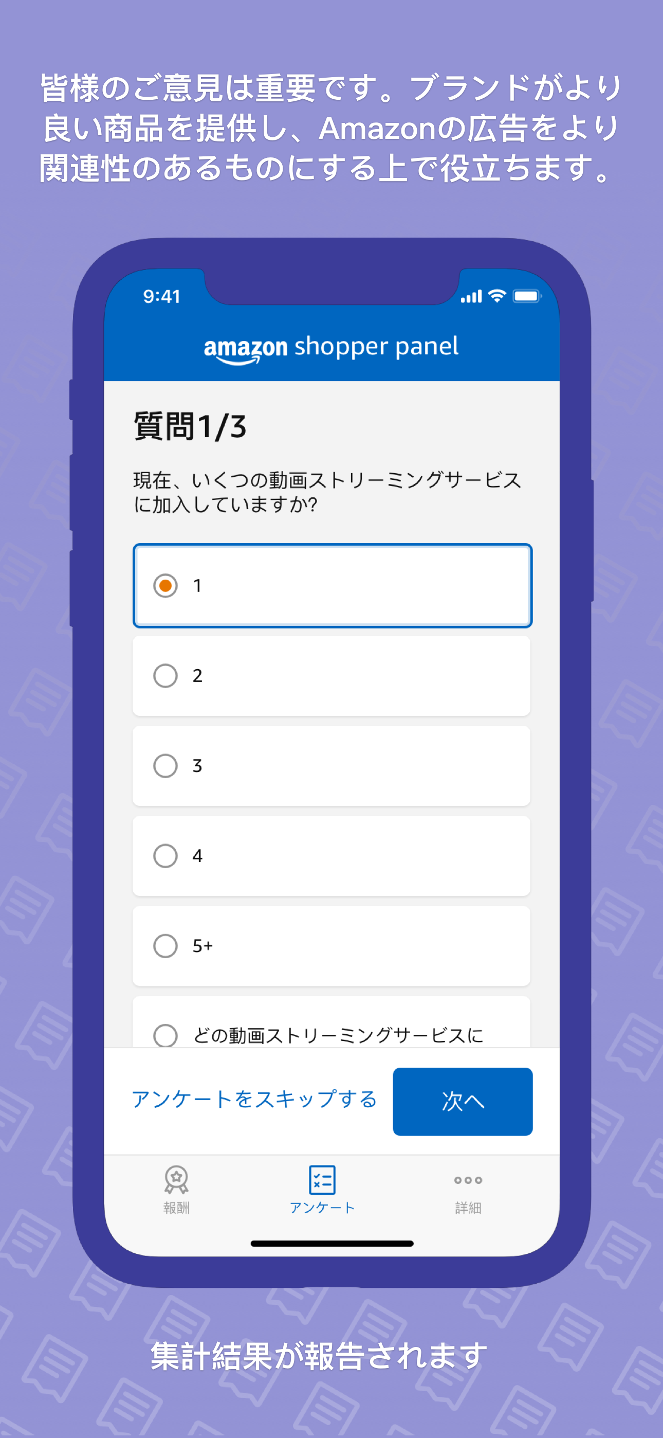 Amazon Shopper Panelへの参加は任意であり、参加者はいつでもアプリの使用や、アンケートの質問への回答を中止することができます。 Amazonは、アンケート回答など、参加者がShopper Panelを通じて明示的に共有することを選択した情報のみを受け取ります。